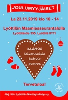 Perinteiset joulumyyjäiset la 23.11. klo 10-14 Lyöttilän seuratalolla. Buffetista puuroa, kahvia glögiä ja torttuja. Tervetuloa! Ilmoittaudu myyjäksi 18.11. mennessä Marjo Piriselle puh. 050 321 2052. Arpajaisvoittoja voi toimittaa Anu Soikkelille puh. 0400 742 953. Järj. Lyöttilän Martat |