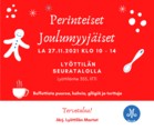 Perinteiset joulumyyjäiset seuratalolla la 27.11. klo 10-14. Buffetista puuroa, kahvia, glögiä ja torttuja. Myyntipöytävaraukset 19.11. mennessä Marjo Piriselle puh. 050 321 2052. Jos haluat lahjoitaa arpavoittoja, toimitathan ne ennakkoon Anu Soikkelille puh. 0400 742 953. Tulethan terveenä ja terveysturvallisuus huomioiden! Järj. Lyöttilän Martat |