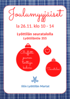 Perinteiset Joulumyyjäiset lauantaina 26.11. klo 10.00-14.00 seuratalolla. Buffetti. Varaa myyntipaikkasi Jaanalta p. 040 529 7076. Arpajaisvoittoja voi toimittaa ennakkoon Anulle p. 0400 742 953.