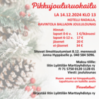Pikkujouluruokailu lauantaina 14.12. klo 13 Hotelli Radalla, jossa nautimme ravintola Balladin joululounaan. Hinnat: lapset 0 - 6 v. 1 € / ikävuosi lapset 6 - 12 v. 17 € jäsenet 20 € ei-jäsenet 34 €