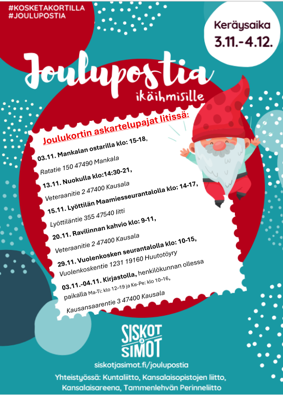 Joulukorttiaskartelupaja la 15.11. klo 14-17 Lyöttilän Maamiesseurantalolla. Tule mukaan osallistumaan Siskot ja Simot ry:n Joulupostia ikäihmisille -kampanjaan, jossa kerätään itsetehtyjä joulukortteja kotihoidon ja asumispalvelujen asiakkaille. Toimitamme kortit kootusti Iitin kunnan keräyspisteeseen. Paikan päällä korttipohjia ja liimaa saatavilla, ota mukaan muut materiaalit ja tarvikkeet. Glögi- ja piparitarjoilu. Tapahtuma on kaikille avoin, tervetuloa! Järj. Iitin Lyöttilän Marttayhdistys ry ja Iitin kunta