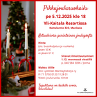 Pikkujouluruokailu pe 5.12. klo 18 Yli-Kaitala Resortissa, Kaitalantie 323. Siellä nautimme tilausravintola Ketunleivän perinteisen joulupöydän antimista. Bussikuljetus. Hinta 50 € jäsen ja 61 € ei-jäsen. Maksu Iitin Lyöttilän Marttayhdistys ry:n tilille FI71 5750 0120 1128 01 viesti: ruokailu, osallistujan nimi. Sitovat ilmoittautumiset 1.12. mennessä Jonnalle viestillä p. 040 584 5096. Tapahtuma on kaikille avoin. Tervetuloa! Järj. Iitin Lyöttilän Marttayhdistys ry |