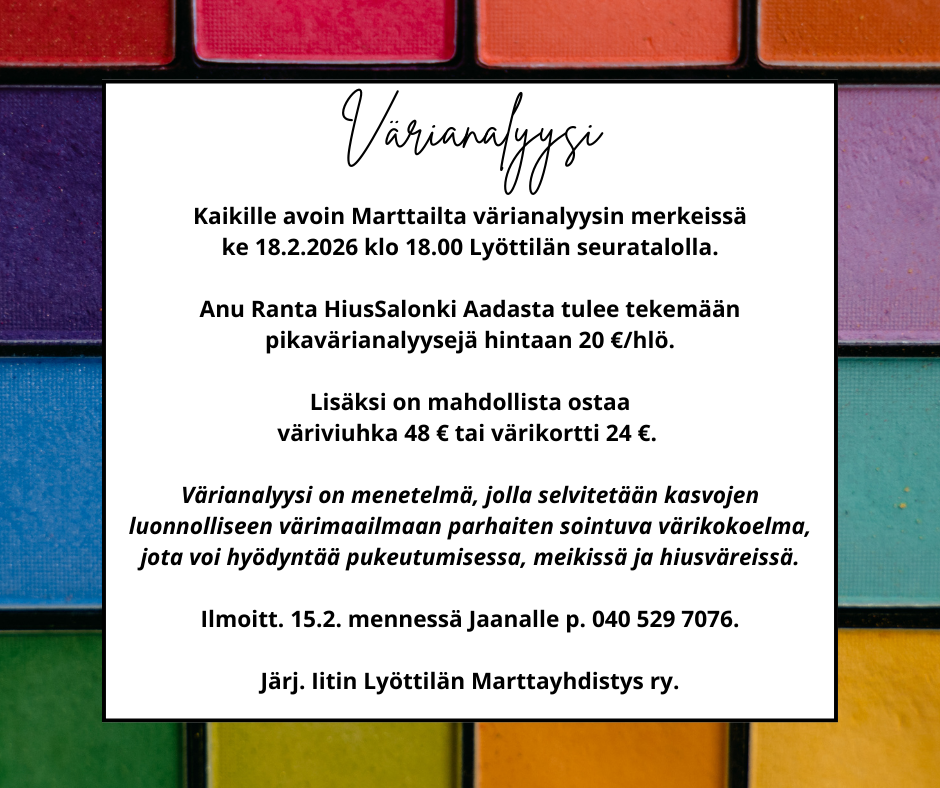 Kaikille avoin Marttailta värianalyysin merkeissä ke 18.2. klo 18.00 Lyöttilän seuratalolla. Anu Ranta HiusSalonki Aadasta tulee tekemään pikavärianalyysejä hintaan 20 €/hlö. Lisäksi voit hankkia väriviuhkan 48 € tai värikortin 24 €. Värianalyysi on menetelmä, jolla selvitetään kasvojen luonnolliseen värimaailmaan parhaiten sointuva värikokoelma, jota voi hyödyntää pukeutumisessa, meikissä ja hiusväreissä. Ilmoitt. 15.2. mennessä Jaanalle p. 040 529 7076. Järj. Iitin Lyöttilän Marttayhdistys ry |