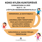 Koko kylän Kuntopäivä su 6.4.2025 klo 11-14. Reippaile Lyöttilän Maamiesseurantalolle, perillä Martat tarjoilee rokkaa ja kahvit. Klo 13.30 liikunnallinen tanssituokio ilman paria lavatanssiaskelin tanssimusiikin tahdissa Eija-Liisa Virran johdolla. Kaikenikäiset ja -tasoiset liikkujat, tervetuloa! Järj. Lyöttilän Martat |